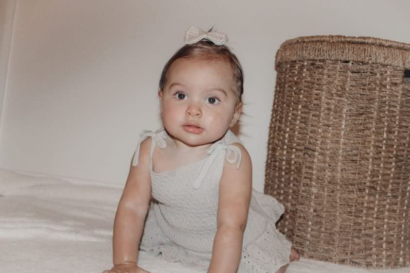 Esmae wearing her Hair Bow Clip in ‘Champagne’ from the Neutrals Set