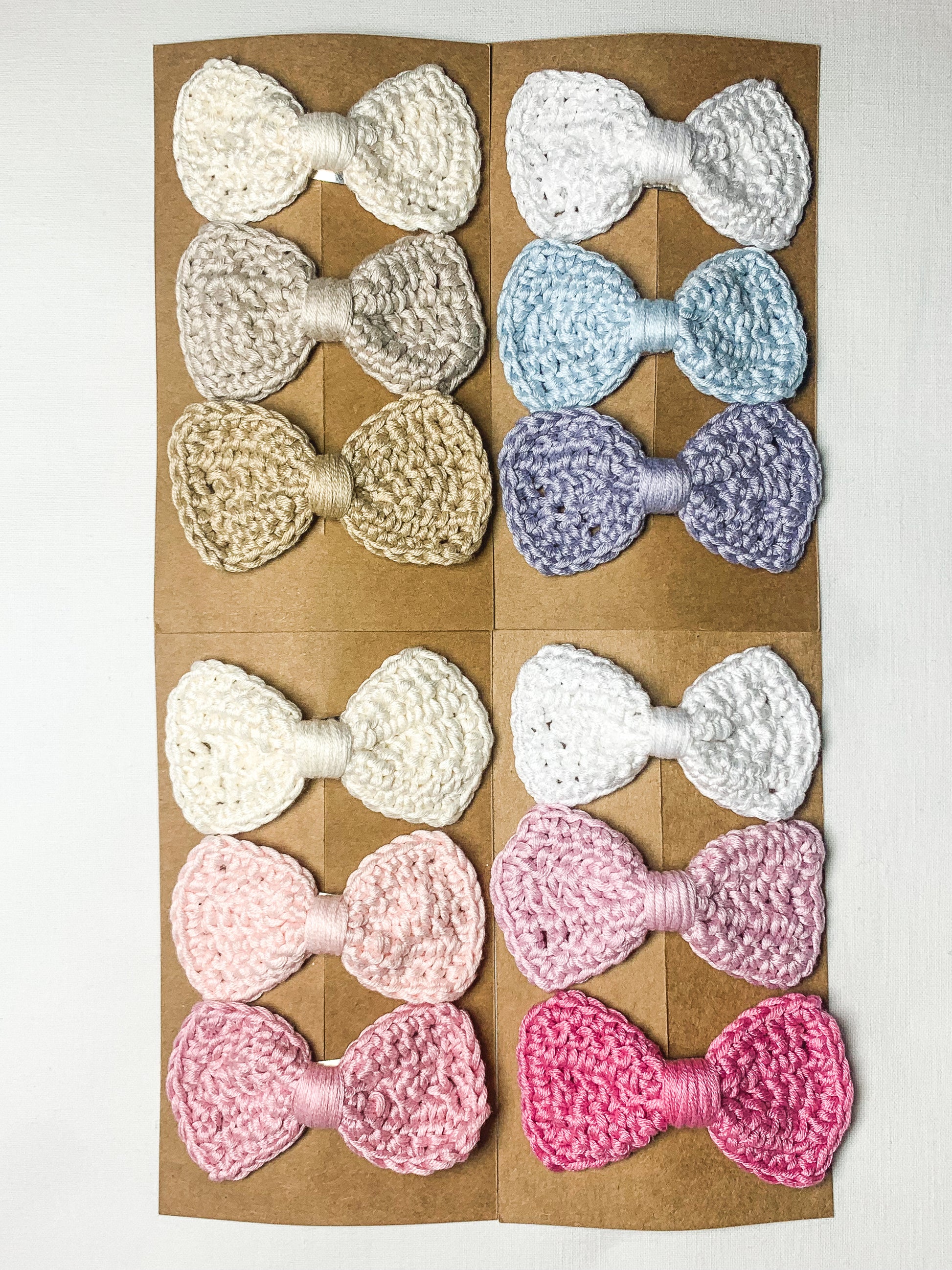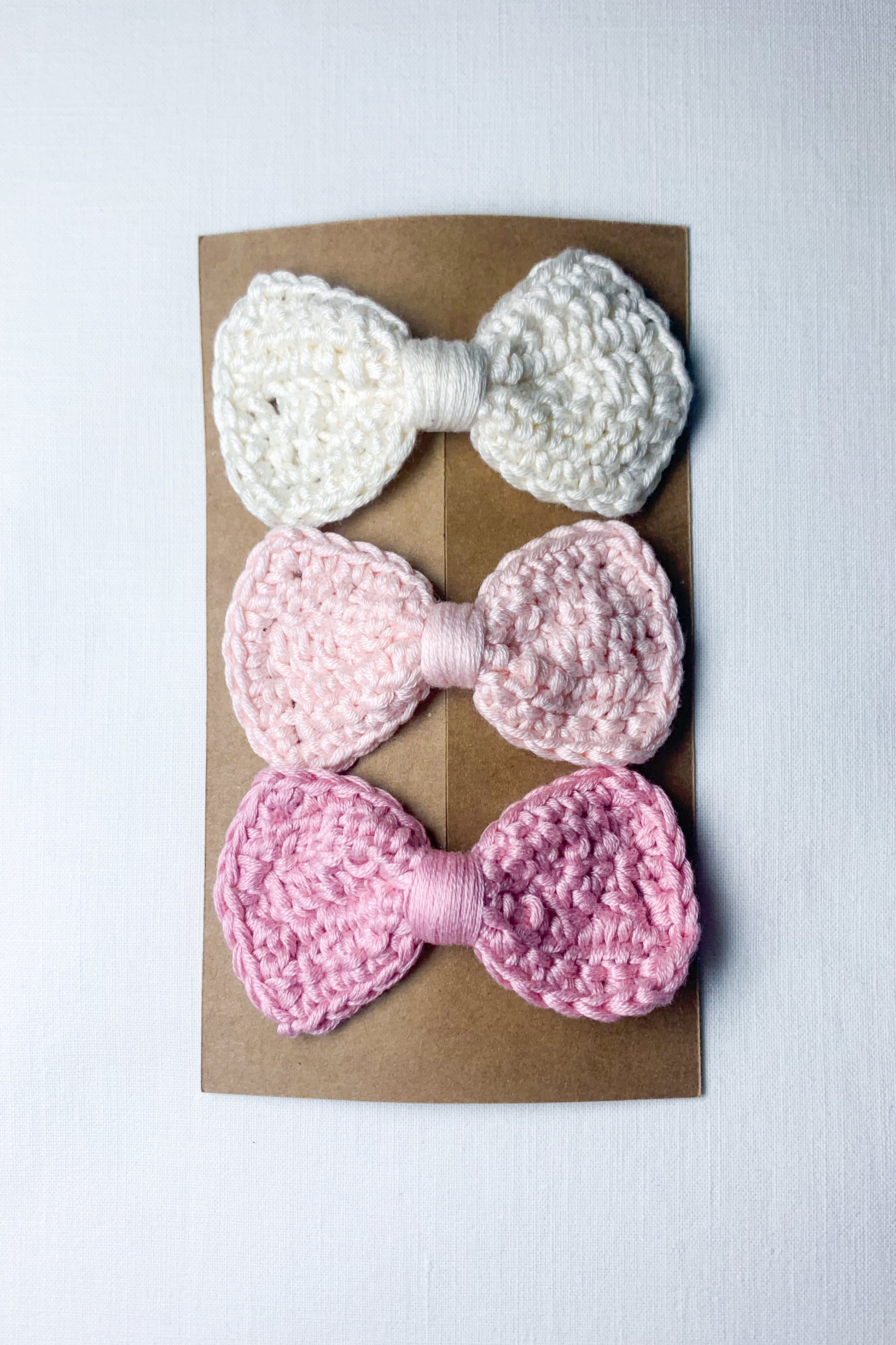 This set of 3 handmade crocheted bow hair clips come in a selection of colours to match with any look. Crafted with 100% cotton, securely sewn on to metal clips to make them more durable than glue, they are suitable for any occasion. Clip one each above bunches, or to hold back baby hairs or a fringe. A set of luxury accessories that are made to last.