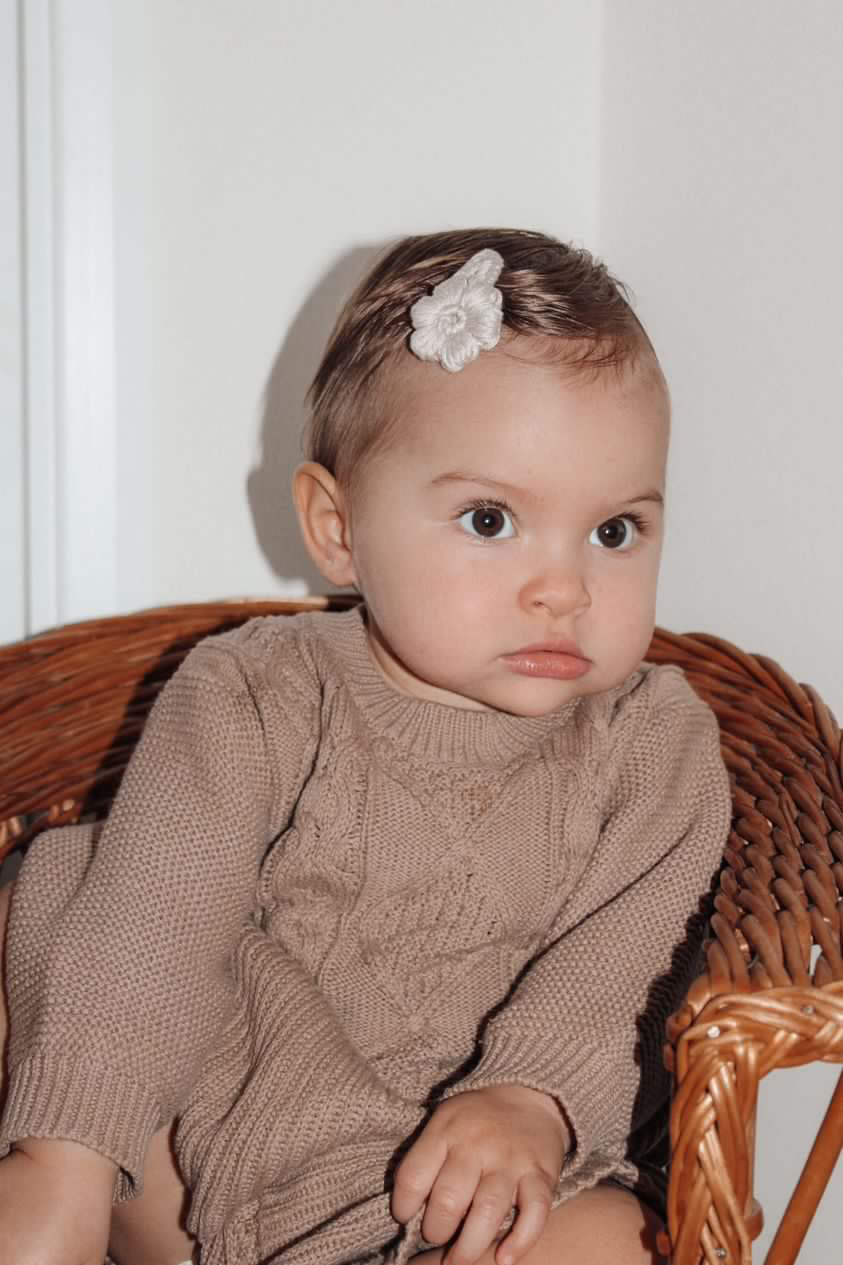 Esmae wearing her Puff Flower Clips in Latte & Champagne